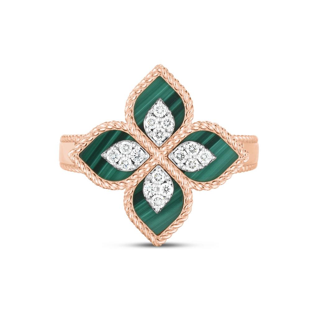 Кольцо Princess Flower из розового и белого золота 18 карат с бриллиантами, малахитом и рубином.